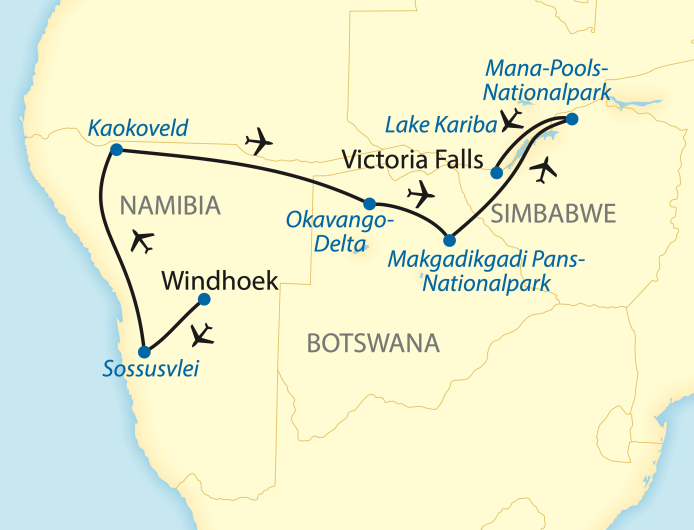 - Innerafrikanische Flüge im Charter-Kleinflugzeug: Windhoek – Namib – Kaokoveld – Okavango-Delta – Makgadikgadi – Mana Pools – Victoria Falls