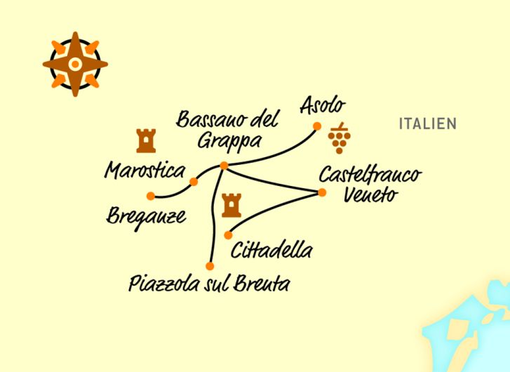 Die idyllische Landschaft rund um Bassano del Grappa mit ihren grünen Hügeln ist wie fürs Radfahren geschaffen! Auf Ihren Tagestouren lernen Sie die gastfreundlichen Veneter kennen und verkosten lokale Spezialitäten wie den Süßwein Torcolato, Grappa und den ausgezeichneten Asolo-Prosecco. Buon divertimento!
