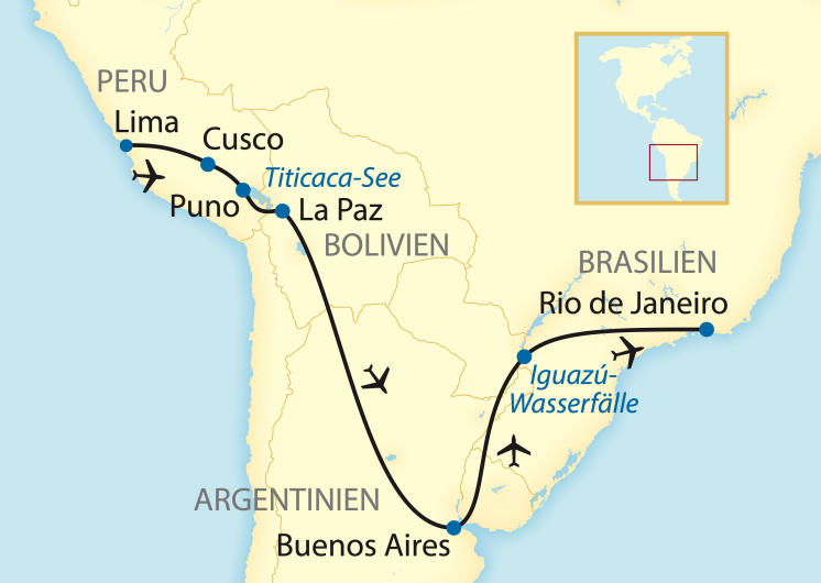 Diese Reise führt Sie in einer kleinen Gruppe mit höchstens 12 Gästen quer durch den südamerikanischen Kontinent: vom Pazifik im Westen über die majestätischen, schneebedeckten Anden bis nach Rio de Janeiro, der schönsten Stadt der Welt. Es erwarten Sie grandiose Landschaften, einzigartige Zeugnisse längst vergangener Hochkulturen und pulsierende Metropolen. Die beeindruckenden Ruinen von Machu Picchu, der sagenumwobene Titicaca-See, die gewaltigen Wasserfälle von Iguazú und Buenos Aires, die Wiege des Tangos, sind nur einige Ihrer Reisehöhepunkte.