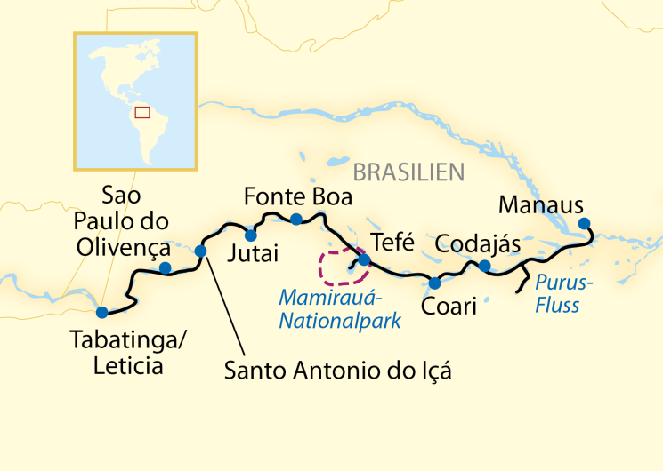 Reisen Sie an Bord des komfortablen Boutique-Schiffs MS Jangada von Tabatinga 1.600 km ostwärts – tief hinein in das unberührte und kaum besuchte Herz des Regenwalds – bis nach Manaus. Kaimane, Brüllaffen und Piranhas, Urwaldriesen wie aus einer anderen Welt und Früchte, deren Namen Sie noch nie gehört haben. Ureinwohner, Abenteurer, Missionare und bunte Stelzendörfer irgendwo im Nirgendwo. Grüne Lunge der Erde – es ist unmöglich, sich dem exotischen Zauber dieser unendlich facettenreichen Flora und Fauna zu entziehen. Machen Sie sich gefasst auf die vielleicht intensivste Reise Ihres Lebens!