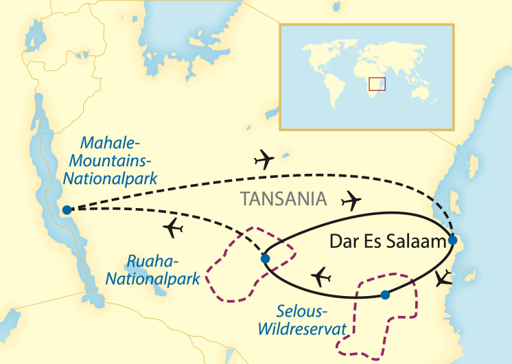 Sie reisen gern privat zu Ihrem Wunsch-Termin, möchten Safaris intensiv erleben und lieben die weniger besuchten, aber wildreichen Naturparks? Sie genießen den Komfort eines romantischen Safari-Camps mit persönlichem Service? Dann ist diese Privat reise zum Selous-Wildreservat und dem fast unberührten Ruaha-Nationalpark genau das Richtige für Sie! Im Kleinflugzeug erreichen Sie bequem die abgelegenen Natur paradiese und haben somit mehr Zeit für unvergessliche Safari-Momente. Haben Sie Lust, eine Nacht unter dem freien Sternenhimmel zu verbringen? Auf dieser Reise ist es möglich! Wer seine Reise noch verlängern möchte, dem empfehlen wir ein Schimpansen-Trekking im Mahale-Nationalpark.