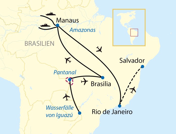 - Ideale Kombination der schönsten Naturparadiese Brasiliens: Amazonas, Pantanal und Iguazú