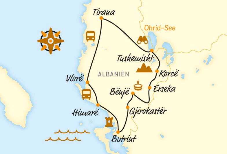 h3. Sie haben Interesse an Flügen (ab 400 € p. P.) oder an Rail & Fly? Sprechen Sie uns an. h3. Vorschläge für Verlängerungen: * Reisen Sie ein paar Tage früher nach Tirana und tauchen Sie ein in diese geschichtsträchtige Stadt. * Bleiben Sie im Anschluss noch einige Tage an der Albanischen Riviera und genießen Sie die sonnenverwöhnte Küste.Diese Reise ist allgemein nicht für Personen mit eingeschränkter Mobilität geeignet. Bitte kontaktieren Sie uns, um hierzu genauere Informationen unter Berücksichtigung Ihrer persönlichen Bedürfnisse zu erhalten.