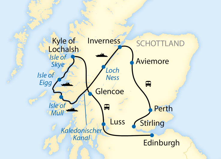 - Komfortable Busfahrten von Stirling nach Inverness und von Kyle of Lochalsh nach Edinburgh