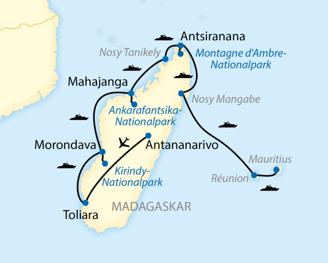 MV Island Sky Nach der Umrundung von Madagaskars äußerster Nordspitze fahren Sie ein in einen riesigen natürlichen Hafen, bestehend aus drei türkisfarbenen Buchten. Hier liegt Madagaskars wichtigste Hafenstadt Antsiranana, vormals Diego Suarez, benannt nach dem portugiesischen Seefahrer Diego Dias, der hier 1543 als erster Europäer landete. Heute erreichen Sie ausnahmsweise trockenen Fußes festen Boden, denn die MV Island Sky ankert direkt an der Mole. Die Fahrt durch das malerische Hinterland führt vorbei an verträumten Dörfern, Mango-, Litschi- und Flammenbäumen. Ihr Ziel ist der besonders spektakuläre Nationalpark Montagne d’Ambre, ein Vulkanmassiv, bewachsen von dichten Bergregenwäldern. Je nach Lust und Laune unternehmen Sie eine leichte oder eine anspruchsvolle Wanderung zu versteckten jadegrünen Kraterseen und tosenden Wasserfällen. Hoch über Ihnen turnen braune Lemuren durch die Baumwipfel. Mit etwas Glück sehen Sie Paradiesvögel, das kleinste Chamäleon und den kleinsten Frosch der Welt. Am frühen Nachmittag stechen Sie im Hafen von Antsiranana wieder in See – mit Kurs Südost. (FMA)