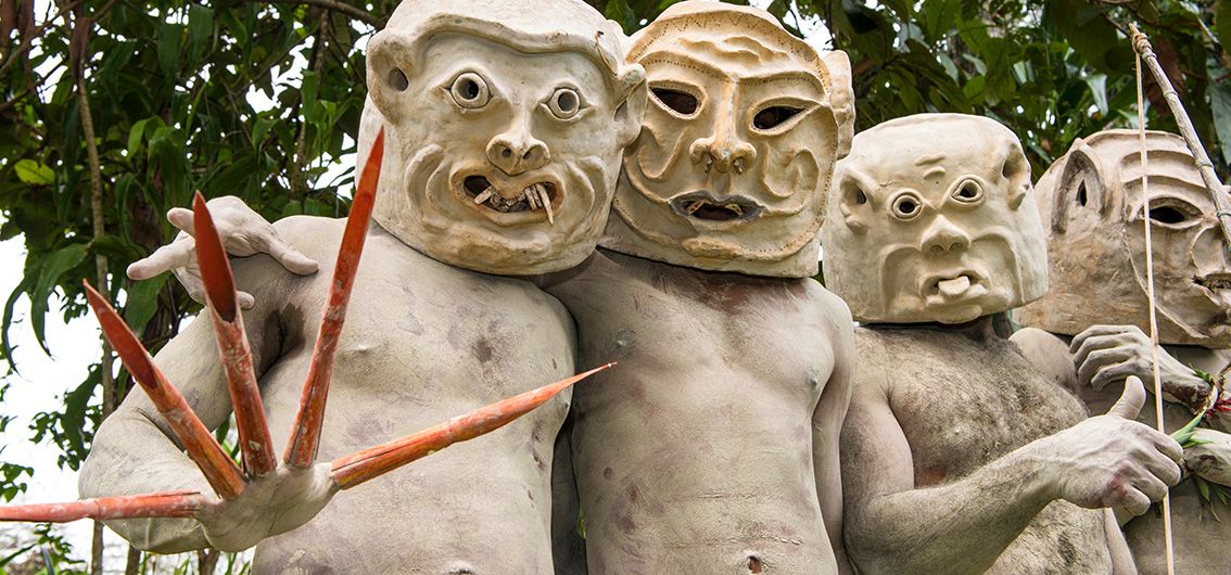 Papua-Neuguinea – 1.000 Stämme, 1.000 Sprachen, 1.000 Farben! In den abgeschiedenen Dörfern des Hochlands, zwischen Vulkankegeln und Hochtälern, begegnen Sie dem Tambul-Stamm, den Huli-Wigmen, Skelett- und Schlamm-Menschen.